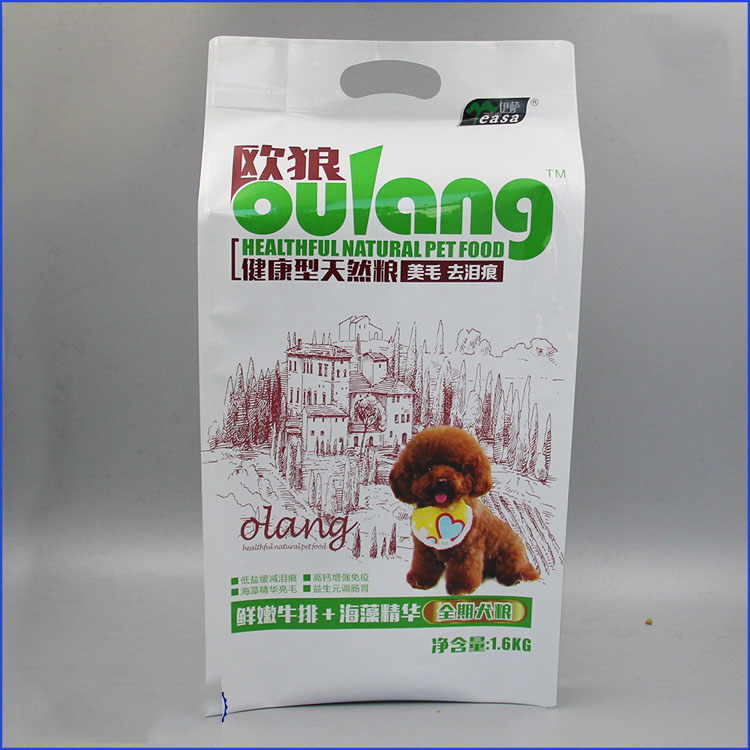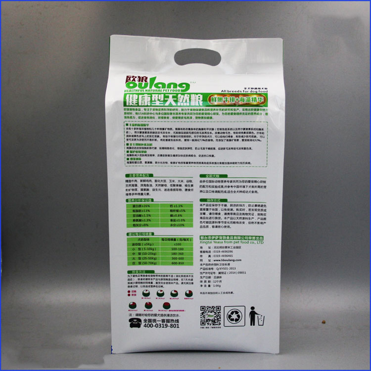 各大廠家專業(yè)生產(chǎn)的各類的寵物食品袋,各種材料的組合搭配,視乎不同類型的寵物食品品種、每包裝的大小重量、包裝的袋型、寵物食品生產(chǎn)商對包裝袋的測試要求、寵物食品加工食品的處理方法、寵物食品包裝後的保存期要求、寵物食品包裝袋設(shè)計(jì)的要求.....等等各樣訊息組合一起,分析、平衡而選擇最合理價值的復(fù)合結(jié)構(gòu)。材料選材以外,印刷的配合、附加設(shè)計(jì)如多次開合封囗拉鏈、滑塊拉鏈、單向排氣閥、斜咀管等都有助加強(qiáng)寵物食品包裝袋的最大價值化。寵物食品袋包裝的袋型:平底袋、四邊封袋、站立袋、連體袋、背封袋等