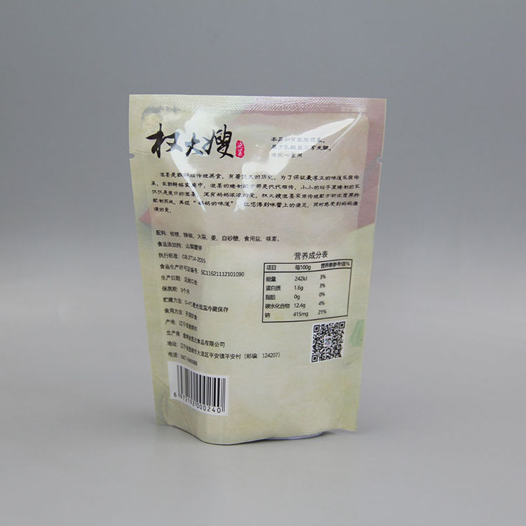 巨人食品包裝袋采用復(fù)合材料制作而成,有PA、PET、BOPP、鋁箔、牛皮紙、PET、高壓PE、CPP、蒸煮CPP等多種材質(zhì),我們會(huì)根據(jù)客戶需求與產(chǎn)品特性為您制作出滿意的包裝。