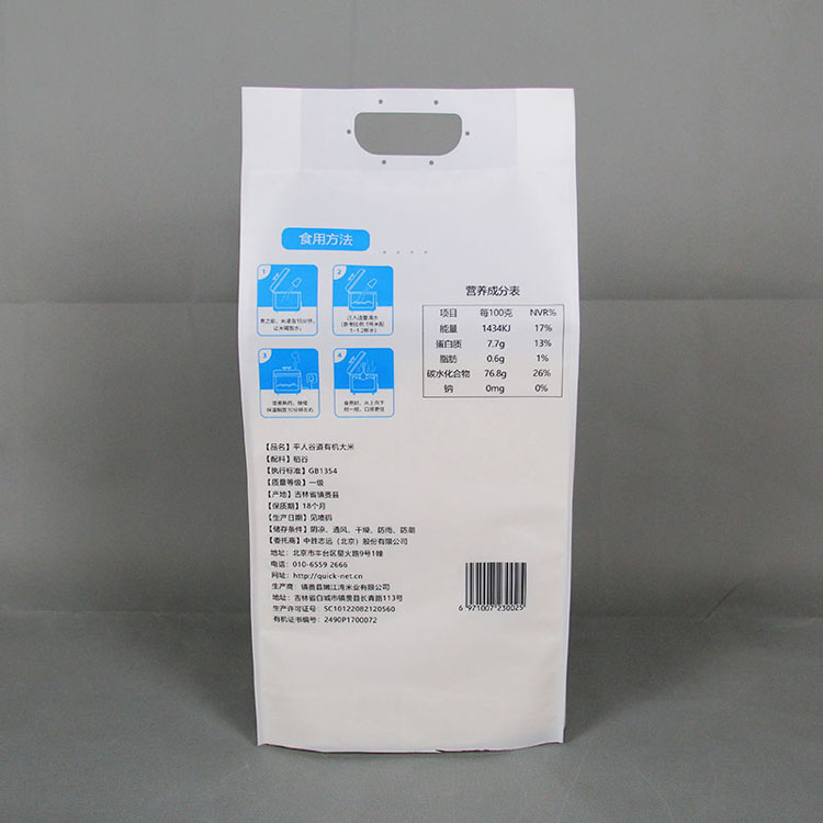 大米小米包裝袋有時候作為直接包裝,因此需要做成真空袋,又稱貼身防潮袋、鋁箔袋、鋁塑復(fù)合袋,其材質(zhì)一般為PET/AL/CPE或PET/NY/AL/CPE.其中PET——印刷效果好,NY——透氧性低,AL——阻隔性強、不透光,CPE——包裝內(nèi)層。膠水:水溶性膠水(更加衛(wèi)生、環(huán)保、無溶劑殘留量)此產(chǎn)品具有良好的防靜電、隔氧、屏蔽、防潮、遮光功能及優(yōu)良的熱封性。