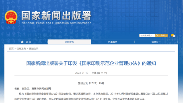 2023年1月10日,國(guó)家新聞出版署官網(wǎng)發(fā)布《國(guó)家印刷示范企業(yè)管理辦法》,2011年12月6日新聞出版總署印發(fā)的《國(guó)家印刷復(fù)制示范企業(yè)管理辦法》同時(shí)廢止。原認(rèn)定的國(guó)家印刷復(fù)制示范企業(yè)到2022年12月31日失效,企業(yè)可以按照本辦法重新申報(bào)?!掇k法》提出,國(guó)家印刷示范企業(yè)分為四類:保障支撐類、創(chuàng)新引領(lǐng)類、智能制造類、專業(yè)特色類。國(guó)家新聞出版署每?jī)赡杲M織開(kāi)展一次國(guó)家印刷示范企業(yè)的評(píng)審認(rèn)定。